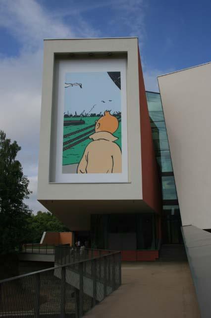 Down the bridged pathway, pedestrians face a mural of Tintin. But, he's not looking at them. His gaze looks ahead of himself, ahead of the crowd, forward and above. Each step accept sthis invitation and approaches until the painting is hovering over heads, until the visitor is peering up at Tintin in the exact position he is looking onward. Entering underneath him into le Musée Hergé, the Hergé fan, or soon-to-be-one, is not just in for a day-out. This is an adventure.
